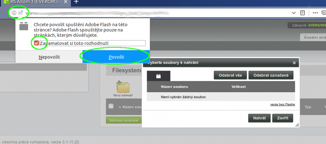 Pro správnou funkčnost nahrávání souborů je nutné mít v prohlížeči Firefox nainstalovaný plugin Flash Plalyer.