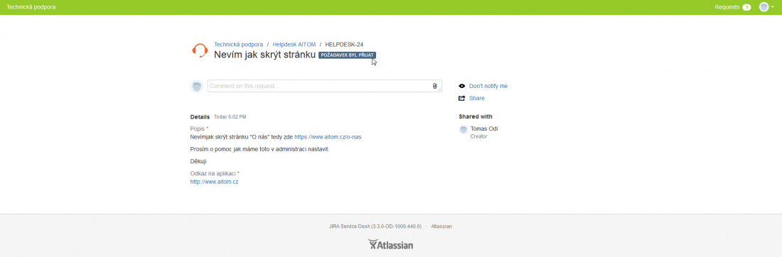 8. Na obrazovce se objeví celý váš požadavek se štítkem Požadavek byl přijat. Zároveň vám přijde do e-mailu potvrzení, že jsme požadavek zaevidovali v systému.