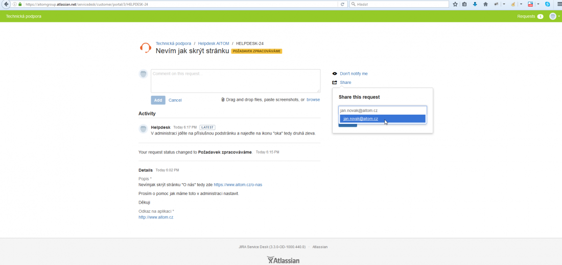 14. Každý požadavek můžete také sdílet s kolegy, kterých se týká. Klikněte na tlačítko Share v pravém sloupci a vepište o okýnka jméno kolegy, se kterým chcete požadavek sdílet.