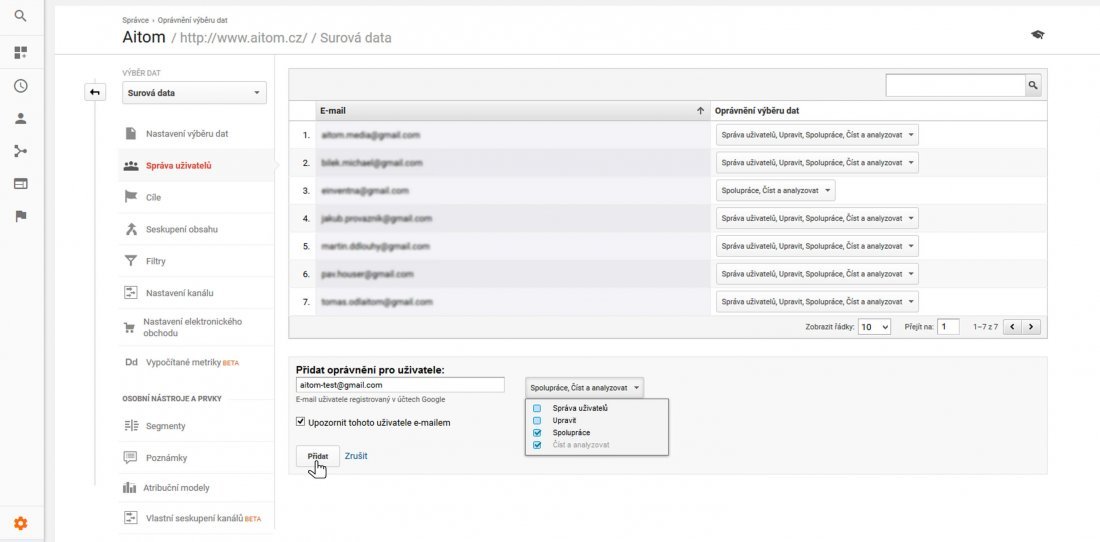 1. Přístupy do GA bude potřebovat celá řada lidí. Přístupy můžete nasdílet a přidělovat lidem různá práva.
