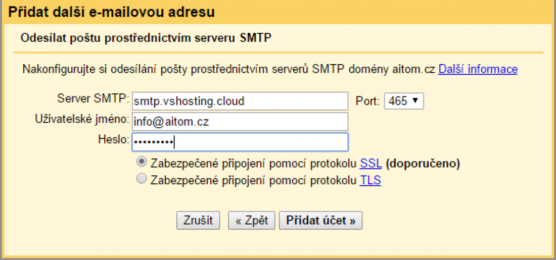 Pozor: Vždy musíte zaškrtnou políčko "Zabezpečené připojení pomocí protokolu SSL"