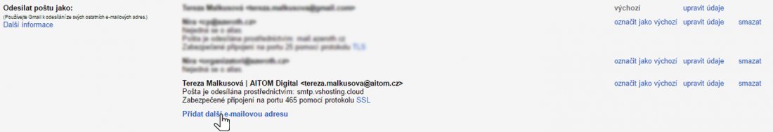 2. Sjeďte k poli "Odesílat poštu jako:" a klikněte na "Přidat další e-mailovou adresu"